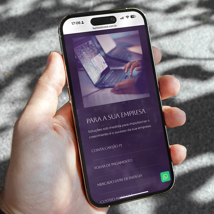 Criar o novo site institucional da Fearless Invest, uma gestora de investimentos que precisava traduzir sua identidade de marca em um ambiente digital moderno, confiável e sofisticado. O objetivo era comunicar com clareza sua proposta de valor e gerar autoridade no mercado, tudo isso com uma experiência intuitiva e conteúdo bem estruturado para diferentes perfis de usuários.