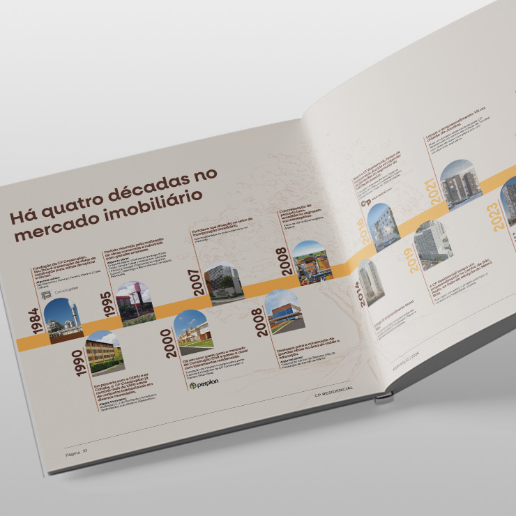 - História e legado: linha do tempo que destaca as quatro décadas de atuação do grupo, contextualizando a solidez da CP Residencial.